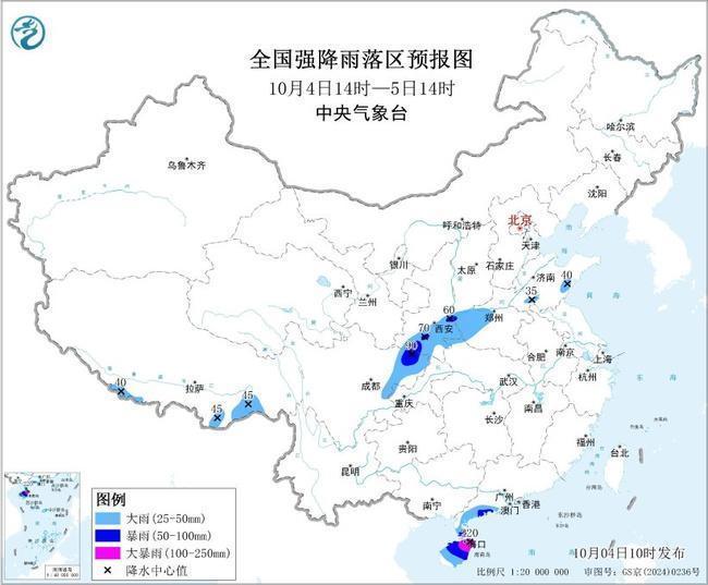 r预计,10月4日14时至5日14时,海南岛中北部、广东西南部、西藏东南部以及四川盆地东部、陕西南部、河南西北部等地部分地区有大到暴雨,其中,海南岛东北部局地有大暴雨(100~220毫米);上述部分地区伴有短时强降水,最大小时降雨量20~40毫米,华南局地可超过80毫米。